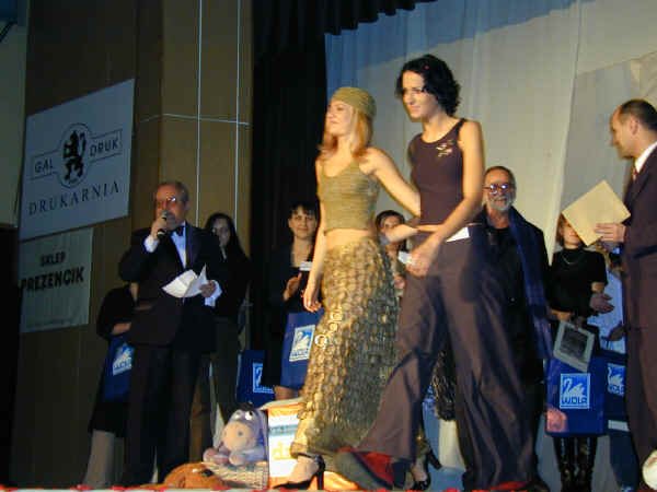 SIEBIE" 2002. Suwałki reprezentowały dwa zespoły. Trzy uczennice z Zespołu Szkół Sióstr Salezjanek oraz trzy z Zespołu Szkół nr 6 wykonały na finałowy pokaz swoje wyroby. Do finału zostało zakwalifikowanych 47 wzorów z 272 zgłoszonych. Dziewczęta z przyjemnością obejrzały je na modelkach podczas gali w sali widowiskowej a było na co popatrzeć. Grand Prix festiwalu przyznawaną przez JURY PROJEKTANTÓW zdobyła Alicja Podpora z Tomaszowa Mazowieckiego - nagrodą jest 6 dniowa wycieczka do Paryża dla dwóch osób Nagrodę JURY SPONSORÓW w kategorii "kolekcja" otrzymała Kasia Bielaszewska z Łaska Nagrodę JURY SPONSORÓW w kategorii "wzór pojedynczy" otrzymała Kasia Bielaszewska z Łaska Dzięki hojności sponsorów na uczestników spadł deszcz nagród co w obecnych czasach jest rzadkością. |